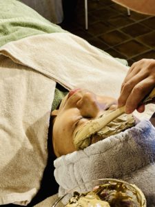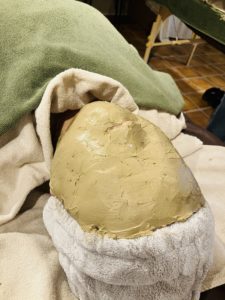 クレイの重みが肌にやさしい圧をかけ、リンパや血流の流れをサポートしてくれることを実感。クレイを顔の中心から外側へ置き、耳下・鎖骨のリンパへ流すように塗布していきます。